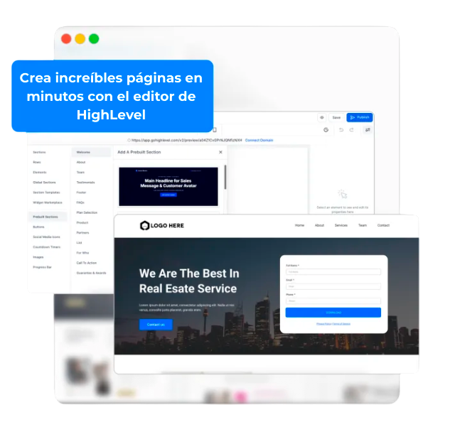 Puedes crear sitios web completos, embudos de ventas y páginas de destino Nuestra plataforma intuitiva te permite crear sitios web completos con menús personalizados. ¡Crea landing pages atractivas y de alto rendimiento en un solo lugar!