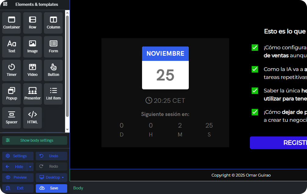 ¿Tienes problemas con el texto? La IA te ayuda → Simplemente haz clic en el botón "IA" dentro del creador de embudos de tu webinar para generar al instante titulares, beneficios y textos de venta persuasivos.