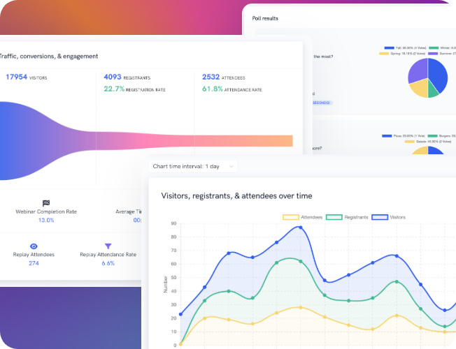 Realiza un seguimiento de las métricas más importantes de tu seminario web → Mira instantáneamente las tasas de conversión de la página de registro, la asistencia promedio, los puntos de abandono, los clics en ofertas y más en nuestro panel de control claro como el cristal, para que puedas ajustar y mejorar los resultados en tiempo real.