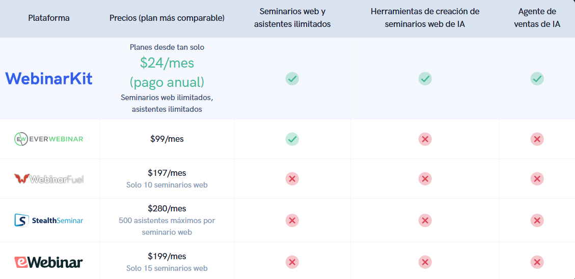Sin tarifas excesivas por asistente → A diferencia de otras plataformas que te cobran más a medida que creces, WebinarKit te ofrece total libertad a un precio simple.