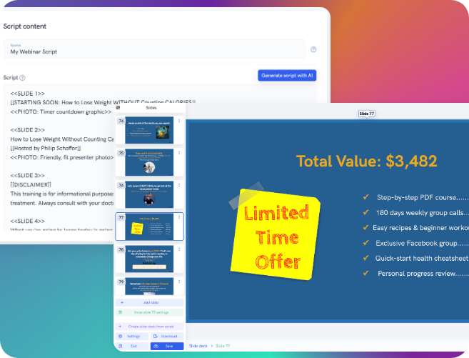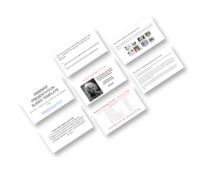 Sube tu presentación o crea una con nuestro creador de seminarios web. Introduce tu sitio web o unas líneas sobre tu oferta y WebinarKit crea tu seminario web de ventas (guión y diapositivas) en minutos. Olvídate de invertir meses o pagar a agencias más de $10,000 para crear tu presentación antes del lanzamiento.