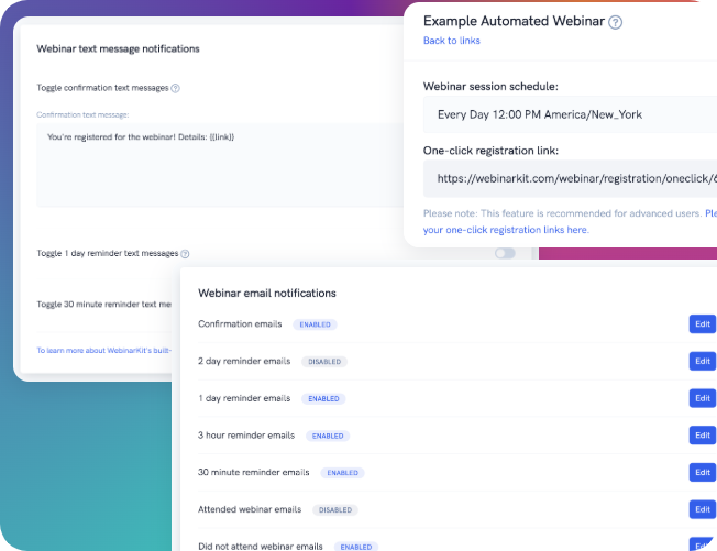 Recordatorios por correo electrónico, SMS y calendario optimizados con IA → Mantén a tu audiencia interesada antes, durante y después de tu seminario web con seguimientos personalizados mediante IA y cronometrados de manera inteligente.