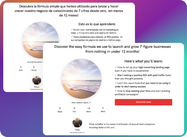 Hospédalo directamente en WebinarKit → Utiliza nuestras páginas de seminarios web totalmente optimizadas para maximizar las conversiones sin complicaciones técnicas. Las páginas, los videos y las imágenes de los seminarios web se pueden alojar en WebinarKit.