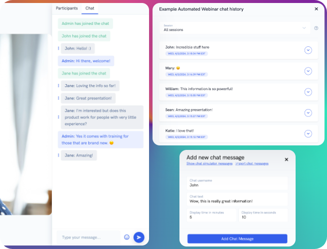 Gestiona preguntas y respuestas sin estar presente → Deja que la IA o los miembros del equipo gestionen el chat en vivo durante seminarios web automatizados, o haz que las preguntas de los asistentes se gestionen automáticamente o se le envíen por correo electrónico, sin necesidad de estar en la sala.